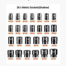 This set includes 26 shallow sockets in sizes ranging from 10mm to 36mm. With clearly etched size markings, you’ll never waste time searching for the right socket—even in low-light conditions. Whether you’re working on general repairs or heavy-duty applications, you’ll always have the right size at your fingertips.