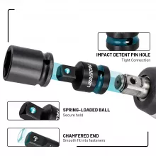 Designed with reinforced impact holes and a spring-loaded detent ball, these adapters lock securely into place, preventing slippage during use. This impact-ready design ensures stability and safety even under heavy loads, so you can focus on precision and power without worrying about your tools failing. The laser-etched size markings allow for quick identification, saving you time on the job.