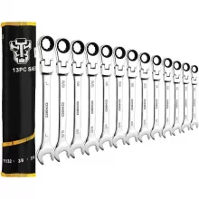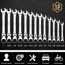 Take on any repair or maintenance task with confidence using this 13-piece Flex-Head Ratcheting Combination Wrench Set. Crafted from high-quality chrome vanadium steel and finished with a high-polish chrome, each wrench is designed to deliver superior strength and durability. The special water drop forging process and heat treatment make them tough enough for demanding jobs, while the corrosion-resistant plating keeps them looking and working like new for years.