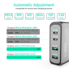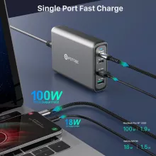 This charger delivers up to 100W through USB-C PD3.0 ports, supporting PPS, SCP, and QC4.0 fast-charging protocols. It can quickly charge MacBook, iPad, iPhone, Samsung, HUAWEI, MiBook, and other compatible devices. The USB-A ports provide up to 18W each, perfect for smartphones and smaller electronics. With advanced GaN technology, the charger achieves high efficiency, up to 90% conversion, while remaining compact and cool during operation.