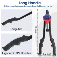 This 16-inch rivet nut tool comes with 11 interchangeable mandrels in both Metric and SAE sizes, along with a generous 185-piece rivnut assortment. That means you’ll always have the right size on hand for whatever your project demands. The long arm design provides extra leverage, reducing effort and hand strain so you can work longer with less fatigue.