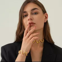 Step into timeless style with this 18K gold plated stainless steel wave bracelet and drawstring necklace set. Designed for women who love to make a statement, this set combines modern fashion with classic charm. The wave-inspired bracelet pairs beautifully with the adjustable necklace, giving you a look that feels both effortless and chic. Whether you are dressing up for a wedding, celebrating an anniversary, or enjoying a night out, this jewelry set will make you shine.