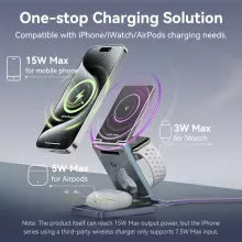 Streamline your charging setup with this 3-in-1 magnetic wireless charger. Designed to power your iPhone, AirPods, and smartwatch simultaneously, it brings ultimate convenience to your desk, nightstand, or travel bag. The foldable design makes it compact and portable, perfect for home, office, or on-the-go use.