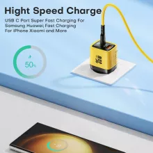 This charger features two ports—one USB-C and one USB-A—allowing you to charge two devices simultaneously. With a maximum output of 35W, the USB-C port delivers rapid PD charging, while the USB-A port offers QC3.0 fast charging up to 30W. Together, they provide a combined output that efficiently powers up your smartphone, tablet, or laptop in no time.