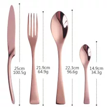 - Includes: 1 Dinner Knife, 1 Dinner Fork, 1 Dessert Spoon, 1 Teaspoon