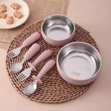 • Complete 4-piece set – Includes bowls, food plate, fork, and spoon.