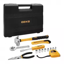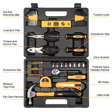 - Complete Set – Includes hex key wrenches, lineman’s pliers, tongue-and-groove pliers, screwdriver bits, measuring tape, claw hammer, screwdriver sets, drive sockets, and a quick-release ratchet.
