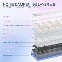 Built with a gasket-mounted structure and a 5-layer noise dampening system, every keystroke feels smooth, stable, and whisper-quiet. The hot-swappable switches let you customize your typing feel without hassle, while vibrant RGB backlighting with multiple modes ensures your setup always shines in style.