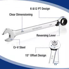 - 3-in-1 design: Open-end, box-end, and ratcheting functionality in one wrench.