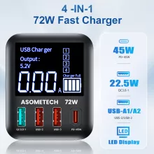Get ready to power up your devices with speed and efficiency using the **72W 4-Port USB C Fast Charger**. Featuring **advanced QC3.0**, **PD3.0**, and **PPS** fast charging technologies, this charger is designed to meet all your charging needs. With a **sleek black finish** and a **clear LED display**, you can charge up to **4 devices** at the same time, all while monitoring their charging status in real-time.
