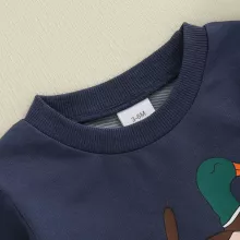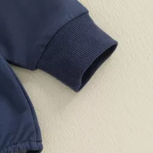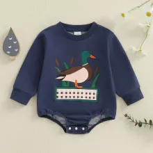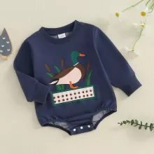 Dress your little one in this charming baby boy fall romper designed to keep him comfortable and stylish all day long. Featuring a playful duck print on a deep navy blue background, this loose-fit jumpsuit is perfect for those crisp autumn days. The soft cotton blend fabric gently hugs your baby’s delicate skin, while the long sleeves and crew neck offer extra warmth without restricting movement.