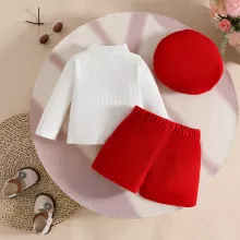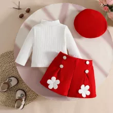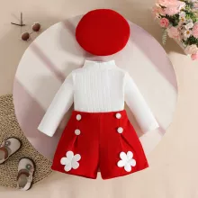 Dress your baby girl in cozy charm with this 3-piece fall outfit set featuring a ribbed turtleneck top, floral patch shorts, and a matching beret. Designed with comfort and cuteness in mind, this outfit is perfect for making your little fashionista stand out during the crisp autumn days.