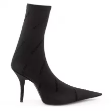 Turn heads and make a statement with the Balenciaga Knife Ankle Boots. Featuring a sleek pointed toe and striking stiletto heel, these boots exude sophistication and contemporary flair. The sock-style design, crafted from spandex fabric with an allover tone-on-tone logo, offers a seamless and snug fit. Whether paired with dresses or tailored trousers, these ankle boots are the perfect accessory to elevate your wardrobe with bold luxury.