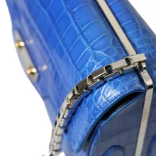 Step into a world of luxury with the BALENCIAGA Neo Classic Chain Shoulder Bag. This exquisite accessory is not just a bag but a statement of sophistication and class. Made from 100% genuine alligator skin, it offers an unmatched blend of durability and elegance. The striking blue hue is beautifully complemented by gold metal detailing, making it the perfect piece to elevate any outfit.