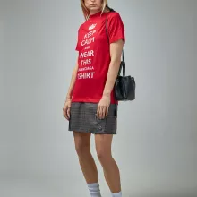 - Paneled Design: Contrasting a monochrome T-shirt with bold lettering and a houndstooth mini skirt for a unique aesthetic.