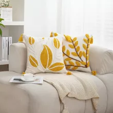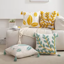 Add a touch of effortless style to your home with this stunning bohemian tufted cushion cover. Featuring a beautifully embroidered leaf pattern in shades of blue and yellow, this cover combines chic design with cozy comfort. The tufted chenille detailing and soft tassels make it an eye-catching accent piece, perfect for elevating any sofa, chair, or bed. Its vibrant yet soothing design brings warmth and personality to your space, whether you’re going for a casual boho look or a touch of luxury.
