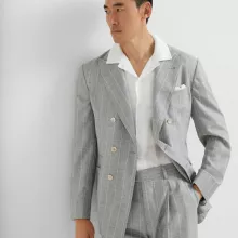 The double-breasted blazer features wide peaked lapels and a structured silhouette, exuding classic charm and refined elegance. The jacket’s front is secured with buttons, offering both function and style, while two welt patch pockets and a slit pocket provide practicality without compromising on design. The matching pants feature an all-over pinstripe pattern, enhancing the suit’s timeless appeal. With a front zipper and button closure, side slit pockets, and welt pockets at the back, these pants combine sophistication with comfort. The belt loops waistband allows for a personalized fit, making this suit truly yours.