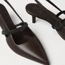 Discover the perfect balance of sophistication and comfort with the Brunello Cucinelli Leather Pumps. Designed to elevate any outfit, these stylish pumps combine timeless elegance with modern flair. Featuring an elongated toe, a leather kitten heel, and an elasticized slingback, these shoes are as functional as they are fashionable. The front band is adorned with iconic appliqué shiny jewels, adding a touch of sparkle that makes these pumps truly unique. Whether you’re heading to the office, a special event, or an evening out, these pumps will ensure you step out in style.