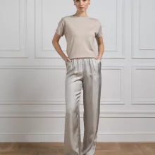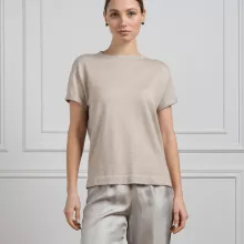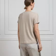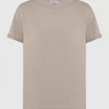 The Brunello Cucinelli Women’s Cashmere T-Shirt is the epitome of sophisticated casual wear. Crafted from luxurious cashmere, this versatile piece adds a touch of elegance to your everyday look. Whether you’re dressing up for a lunch date or layering it with your favorite jacket, this T-shirt will instantly elevate any outfit with its understated style. The delicate glitter effect woven into its fabric catches the light beautifully, giving it a radiant finish that adds a subtle touch of glamour to your wardrobe.
