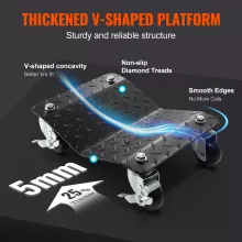 Built from thickened steel panels, the dolly is engineered for strength and long-lasting performance. The concave diamond-patterned platform keeps tires securely in place, adding friction and ensuring stability. Universal swivel casters provide 360-degree maneuverability, while a simple foot brake locks everything down when you need it steady. This combination of strength, safety, and flexibility makes it an essential tool for anyone working on cars, trucks, ATVs, or tractors.
