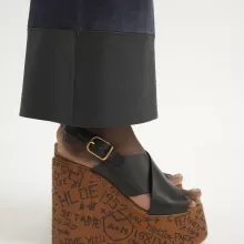 The Chloé Leather Maxime Wedge Sandals are crafted with premium materials and thoughtful details that exude luxury. From wide braided leather straps to an adjustable buckle for a tailored fit, every element is designed with your comfort and style in mind. The wide wood-effect wedge, complete with contrasting lettering details, adds a bold and contemporary twist, while the logo-embossed insole ensures you’re stepping into a piece of Chloé heritage.