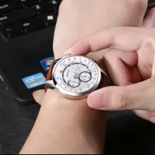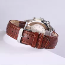 This chronograph watch is more than just a timekeeper. It comes with stopwatch functionality, a calendar date display, and luminous hands for clear visibility in the dark. The tachymeter-inspired driving speed function adds an exciting twist — ideal for car enthusiasts who want to measure average speed with precision. Arabic numeral markers ensure quick readability, while the leather strap with stainless steel buckle provides a secure, stylish fit.