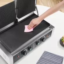 This panini grill stands out with its dual heating system that ensures consistent cooking across the entire surface. The enamel-coated grill plate is not only durable but also distributes heat evenly for flawless results. The adjustable temperature control allows you to prepare a wide range of foods, making it a versatile choice for both commercial and personal use. Plus, its compact design ensures it fits perfectly on any countertop without sacrificing cooking space.