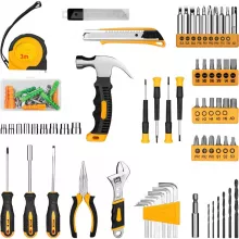 • Comprehensive tool selection including screwdrivers, pliers, hammer, wrench, sockets, measuring tape, and more