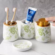 Refresh Your Bathroom Decor with Our Green Plant Pattern Ceramic Set!