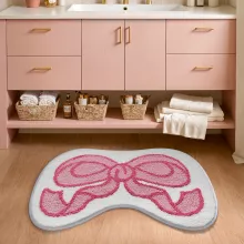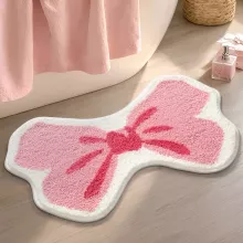 Bring a burst of charm and comfort to your home with this adorable cute pink bow pattern irregular shape rug. Whether you’re decorating a child’s bedroom or adding a playful accent to your bathroom, this tufted carpet is designed to elevate any space. Its soft texture, vibrant color, and whimsical design make it the perfect addition to brighten up your home while providing warmth and coziness underfoot.