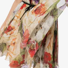 The Dolce & Gabbana Floral Silk Mini Dress isn’t just any dress – it’s a statement piece. The lightweight silk chiffon creates a breezy, feminine silhouette, while the colorful floral design evokes a sense of joy and sophistication. The natural sheen of the silk catches the light beautifully, making this dress perfect for any occasion where you want to feel special and stand out.