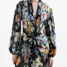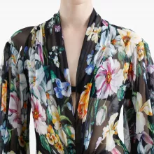 The Dolce & Gabbana Long Flower Chiffon Dress is a masterpiece of high fashion. The semi-sheer chiffon fabric, adorned with a delicate floral pattern, flows effortlessly, creating movement and grace. The shawl V-neckline flatters the décolleté, while the center slit adds a bold, confident touch. Elasticized cuffs and included silk crepe de chine culottes ensure a comfortable fit, allowing you to move freely while exuding elegance. This dress is designed to make you the center of attention at any event.