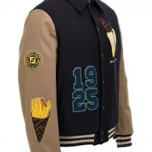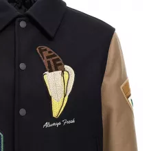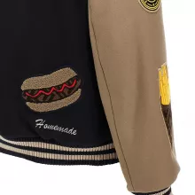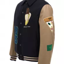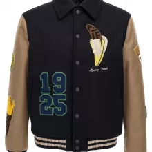 This bomber jacket stands out for its sophisticated mix of classic and contemporary design elements. The contrasting appliqué logo patches instantly catch the eye, giving you a look that’s both recognizable and uniquely your own. Crafted for cooler weather, the fine wool construction ensures you stay warm without sacrificing style. The ribbed detailing on the cuffs and hem creates a sharp silhouette, making it perfect for layering over your favorite outfits.