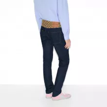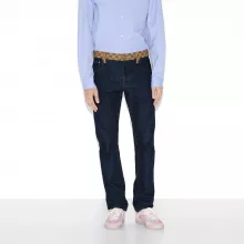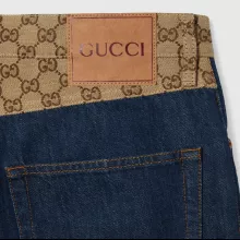 The highlight of these jeans is the iconic GG pattern printed along the waistband. This understated yet recognizable detail adds a touch of luxury that speaks volumes without being overpowering. It’s a subtle nod to Gucci’s rich heritage, making these jeans an instant classic in any wardrobe. The premium-quality denim ensures durability and comfort, while the tapered fit offers a clean, tailored look suitable for a wide range of occasions.