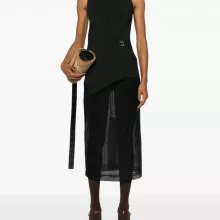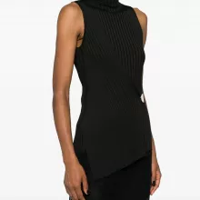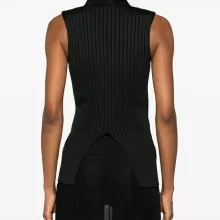 Bring sophistication and a touch of modern elegance to your wardrobe with the Jil Sander Sleeveless Ribbed Top. Perfectly designed for style enthusiasts who value contemporary minimalism, this top features a timeless monochrome pattern that pairs effortlessly with your favorite wardrobe staples. Its high neck, sleeveless silhouette, and asymmetrical hemline create a chic, edgy look that transitions seamlessly from day to night.