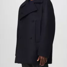 - Double-breasted front button closure for a tailored and structured fit.