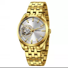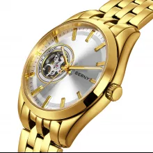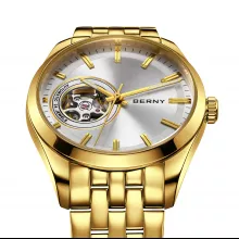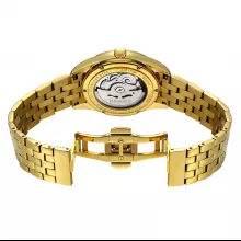 Make a bold statement with this luxury automatic skeleton watch, designed for men who value both sophistication and precision. Its sleek round case, gold-toned finish, and intricately detailed skeleton dial offer a refined balance of fashion and function. With its polished stainless-steel construction and premium sapphire glass, this timepiece is built to turn heads while standing the test of time.