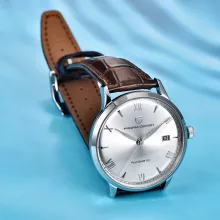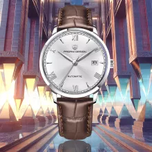 Featuring a scratch-resistant sapphire glass, this watch remains as flawless as the day you first wear it. The polished stainless steel case and band offer both durability and a refined aesthetic, while the Roman numeral display adds a touch of classic elegance. Its round case shape provides a balanced look, suitable for both formal and casual settings. Plus, with its reliable waterproof design, you can enjoy your daily activities without worry.