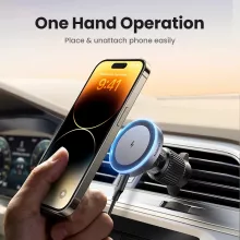 This charger stand offers one-hand control, letting you attach or remove your phone in seconds. Equipped with 18 N52 magnets, it ensures a stable hold even on bumpy roads. The built-in blue LED light acts as a charging indicator, so you always know when your phone is powered. With an adjustable air vent clip, it stays firmly in place without blocking your view.