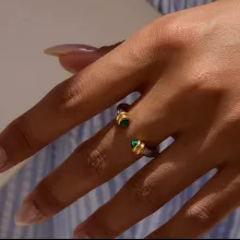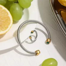 Step into elegance with this stunning minimalist bracelet featuring natural green malachite stone set in an open ring design. Crafted with 18K PVD gold-plated stainless steel, this two-tone piece blends modern sophistication with timeless charm. The ribbed detailing adds a unique touch, making it the perfect balance of subtlety and statement. Designed to complement any outfit, this bracelet is a versatile accessory you’ll reach for again and again.