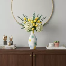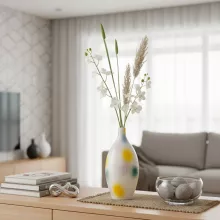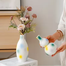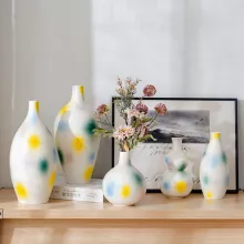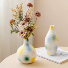 Bring a vibrant touch of modern artistry into your home with this stunning ceramic vase. Its sleek, abstract design combined with colorful hand-painted spots makes it the perfect statement piece for any room. The vibrant hues of yellow, blue, and green are expertly applied on a ribbed surface, adding depth and texture to this exquisite decor item. Whether displayed alone or with your favorite flowers, this vase is sure to impress and become the centerpiece of your living space.