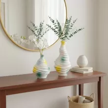 Elevate the look of any room with this stunning modern wavy ceramic vase. With its unique, fluid shape and bold abstract glaze in vibrant hues of yellow, blue, and green, this vase isn’t just a decor piece—it’s a conversation starter. Crafted from high-quality ceramic, this vase effortlessly combines form and function, making it the perfect addition to your living room, office, or dining space.