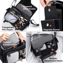 This bag features customizable storage with removable dividers, letting you adapt the interior to your camera, drone, or tablet setup. Multiple compartments, including a zippered mesh pocket, transparent PVC pouch, magnetic pocket, and padded sections, keep small accessories organized and within reach. With a load capacity of up to 11lb, it’s perfect for all your essential gear.