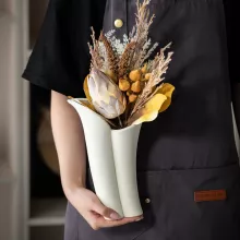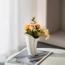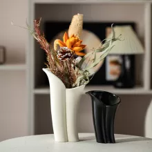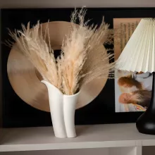 The smooth, matte finish of the ceramic pairs effortlessly with its modern abstract shape, making it an ideal choice for those who appreciate both form and function in their home decor. Designed to hold dried flowers, grasses, or small ornamental arrangements, this vase brings a burst of nature indoors while complementing contemporary aesthetics.