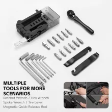 The tool kit is designed to make your bike maintenance easier and quicker. The magnetic screwdriver keeps screws in place while you work, preventing drops or loss. The multi-function ratchet wrench ensures smooth and efficient adjustments, while the tyre lever gives you the leverage you need for tire changes. Everything fits neatly into a portable tool box, just 4.1 x 2.5 inches in size, weighing only about 9.2 ounces, making it pocket-friendly and travel-ready.