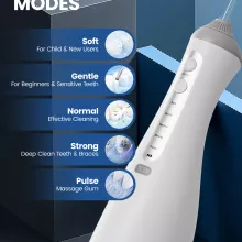 - 5 Cleaning Modes: Child (gentle 40 PSI), Pulse (40–120 PSI for gum massage), Soft (60 PSI for sensitive teeth), Normal (100 PSI for daily use), Strong (120 PSI for deep cleaning)
