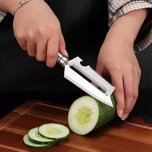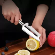 - All-in-One Tool: Functions as a peeler, slicer, fish scale scraper, sugar cane cutter, and bottle opener.