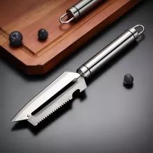 This tool is not limited to peeling vegetables—it’s a true multi-tasker. Use it to peel potatoes, cucumbers, or sugar cane, slice fruits like lemons with ease, scrape fish scales, or even open bottles at your next dinner party. Whether you’re preparing fresh ingredients for a family meal or opening a cold drink, this all-in-one kitchen gadget is ready for action. Designed with a comfortable handle featuring black accent lines, it provides a secure, non-slip grip for safe and smooth operation every time.