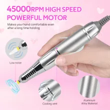 Elevate your nail care routine with this high-speed electric nail drill, designed to deliver professional results from the comfort of your home. With speeds reaching up to 45,000 RPM, this nail drill makes sanding, polishing, shaping, and removing gel polish effortless and precise. Its quiet operation ensures a comfortable experience for both beginners and seasoned nail technicians alike. Compact, lightweight, and portable, this tool is perfect for at-home nail enthusiasts or busy salon professionals who need reliable performance on the go.