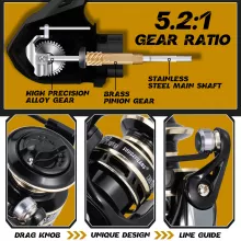 - Precision Spinning Reel – 5.2:1 gear ratio, smooth retrieval, available in 2000 and 3000 sizes.